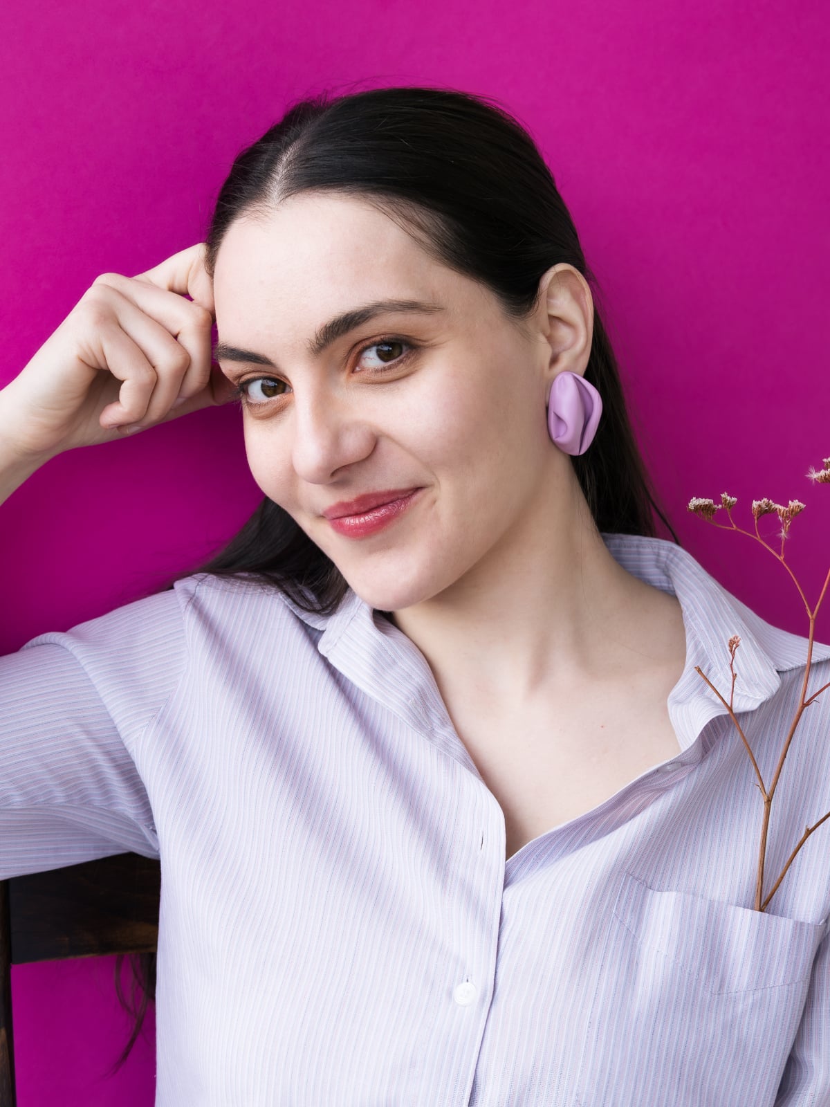 Cerceii FOLDA sunt modelați manual în lut polimeric, inspirați de pliurile textile și formele fluide ale materialelor în mișcare. Cu un design modern și organic, fiecare pereche este unică, fiecare pliu fiind creat intuitiv, fără matrițe sau sabloane.