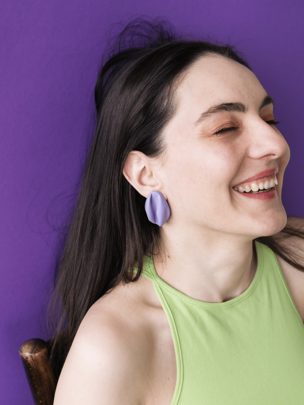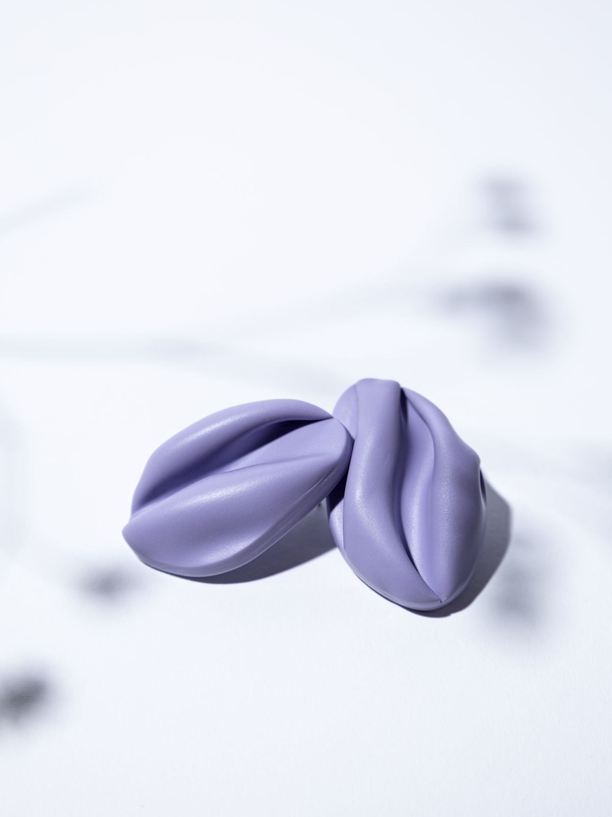 FOLDA sunt cercei statement cu un design fluid, inspirați de pliurile textile, modelați manual din lut polimeric – design mininalist și expresiv.