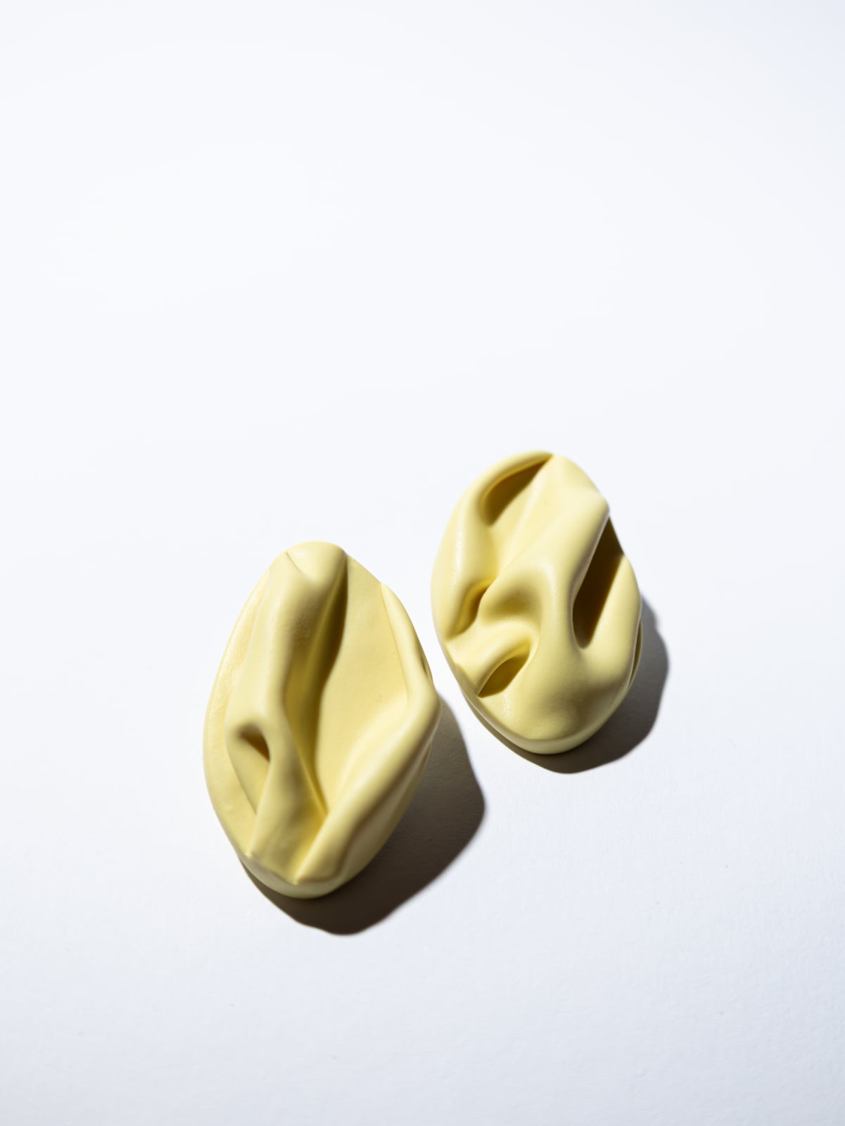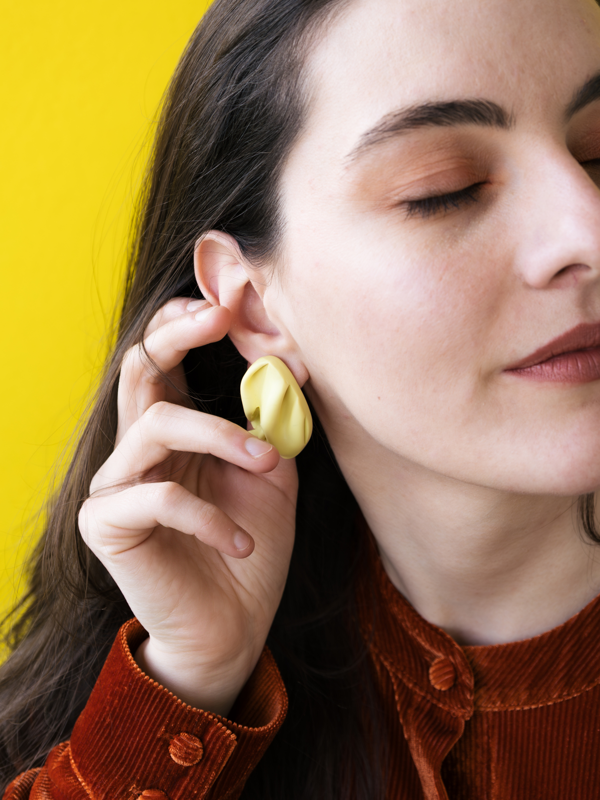 FOLDA sunt cercei statement cu un design fluid, inspirați de pliurile textile, modelați manual din lut polimeric – design mininalist și expresiv.