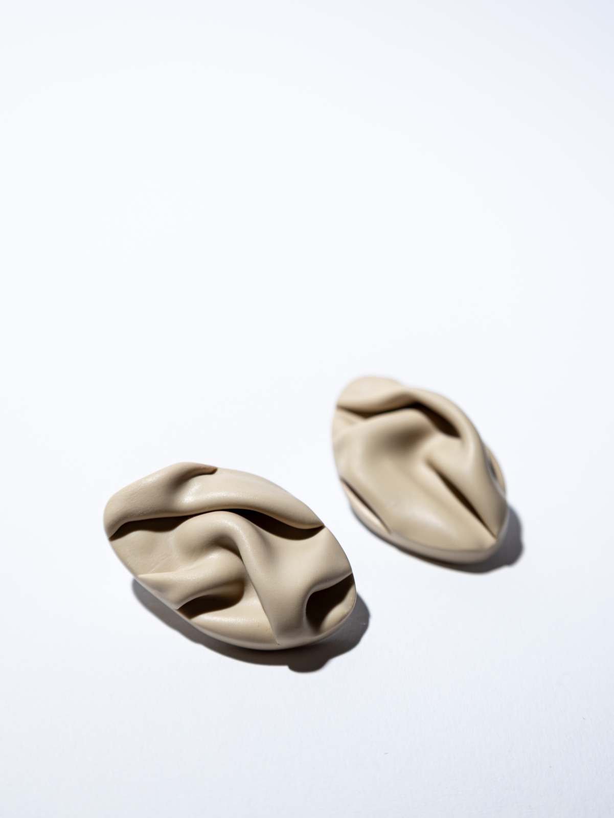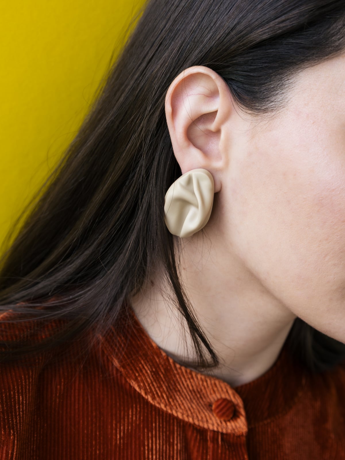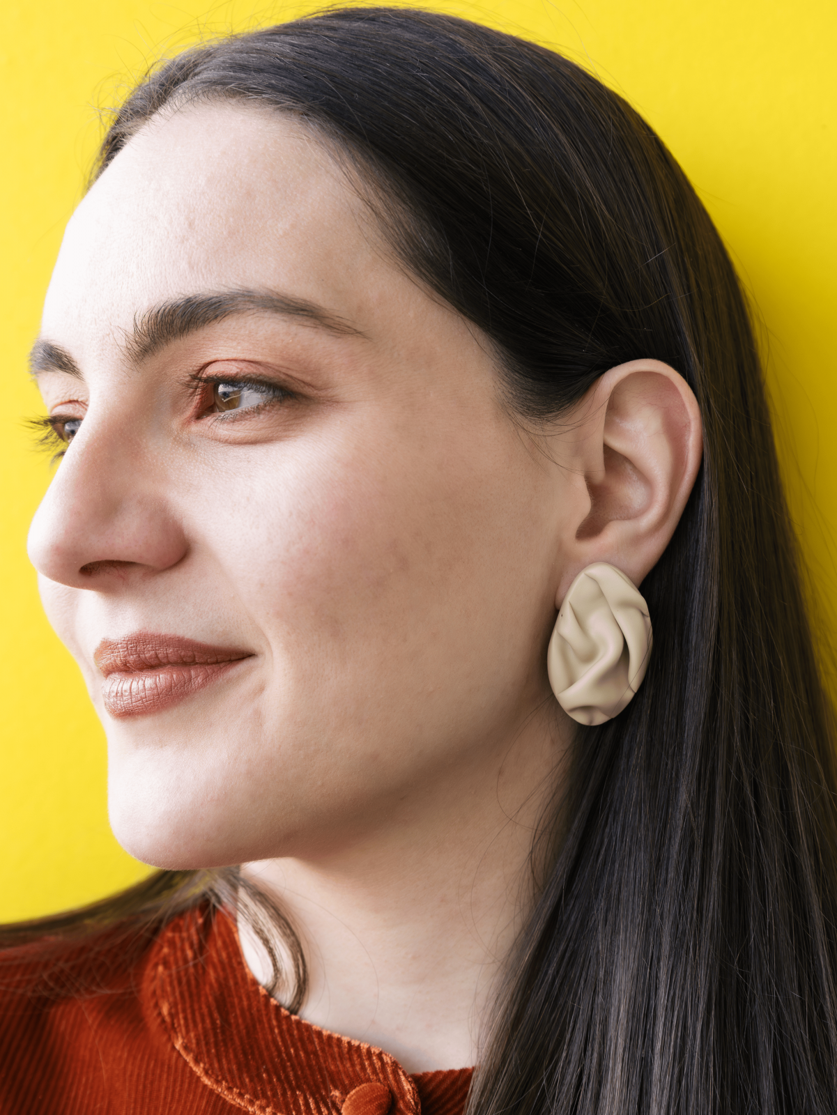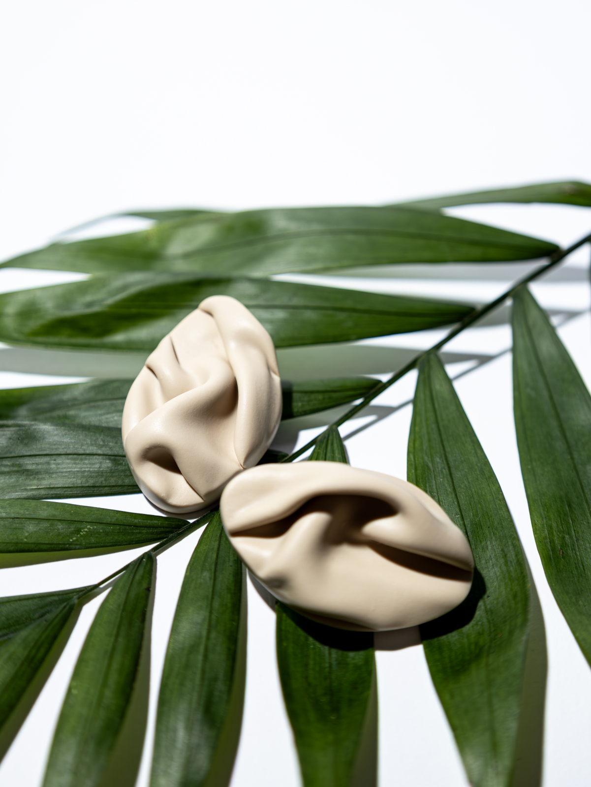 Cerceii FOLDA sunt modelați manual în lut polimeric, inspirați de pliurile textile și formele fluide ale materialelor în mișcare. Cu un design modern și organic, fiecare pereche este unică, fiecare pliu fiind creat intuitiv, fără matrițe sau sabloane.