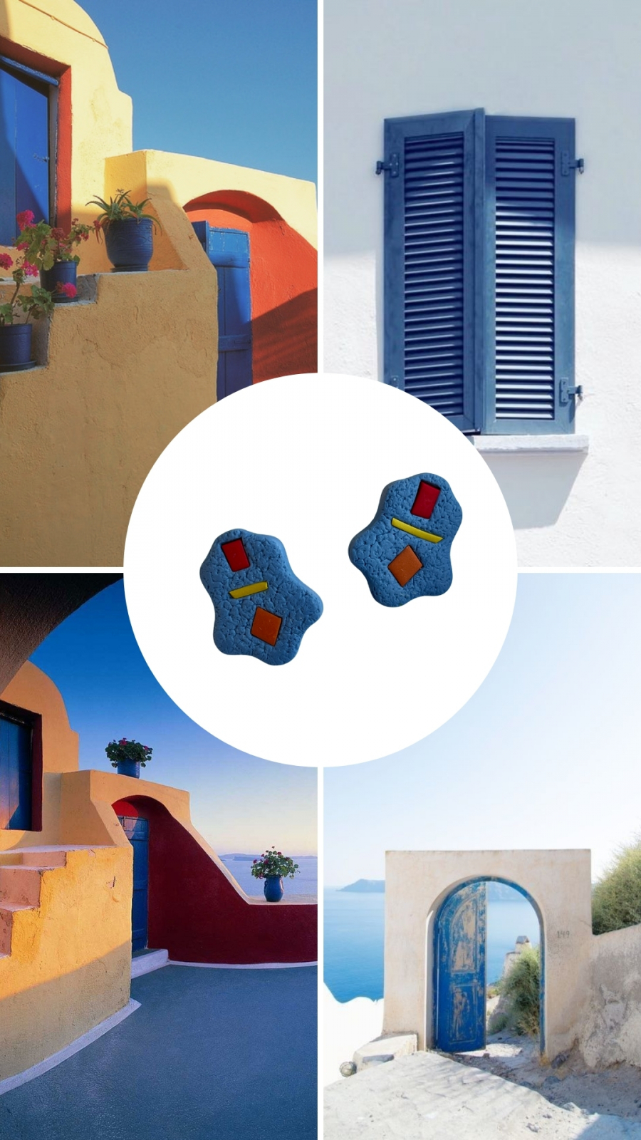 Cercei în nuanța albastrului de obloane și rame de geam, cu detalii de mozaic. Imperfecțiunile naturale și compoziția unică amintesc de plimbările prin sate de coastă.